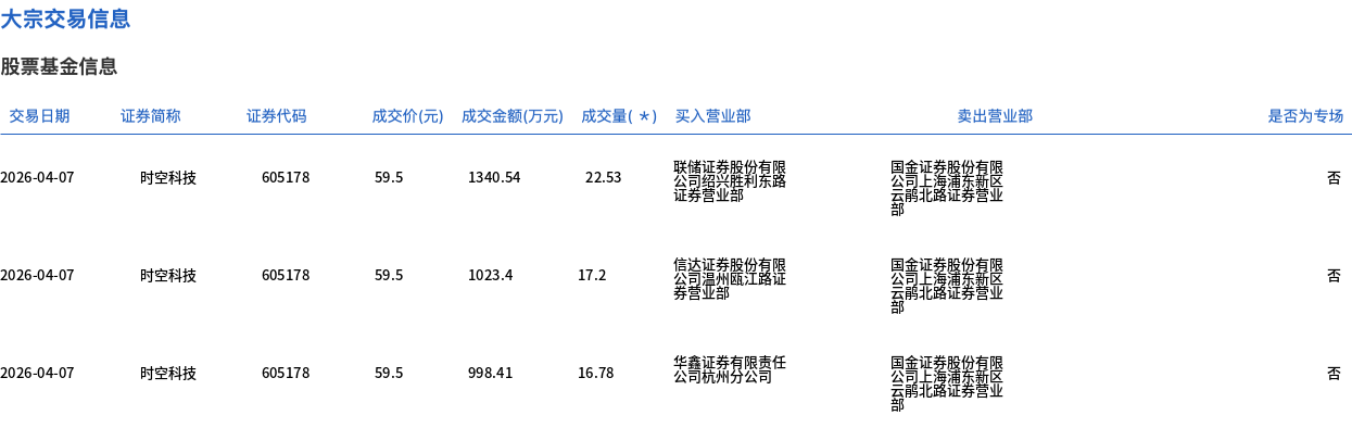 4月7日,时空科技大宗交易成交56.51万股,成交额3362.35万元,占当日总成交额的14.74%,成交价59.5元,较市场收盘价68.4元折价13.01%。