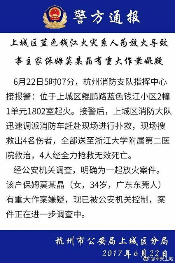 6月22日清晨5点左右,位于杭州城东的蓝色钱江小区2幢1单元1802着火,保姆从专用通道逃走,但是这一家的女主人和三个孩子抢救无效,最终死亡。