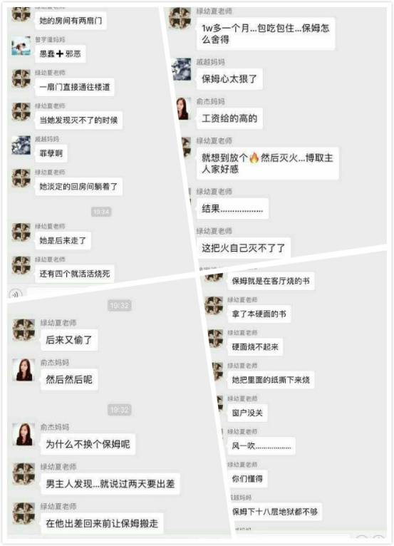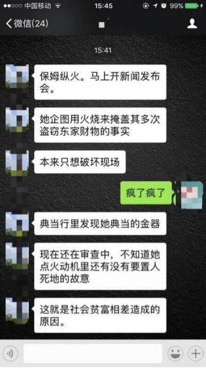 关于纵火原因,有当地知情人士微信群里讨论的几张截图,说保姆本来是想用火烧来掩盖其多次盗窃东家财物的事实,想破坏现场,但是最后却酿成四死的惨剧。究竟是故意纵火还是过失纵火,目前还不能确定,只能等待警方调查了。