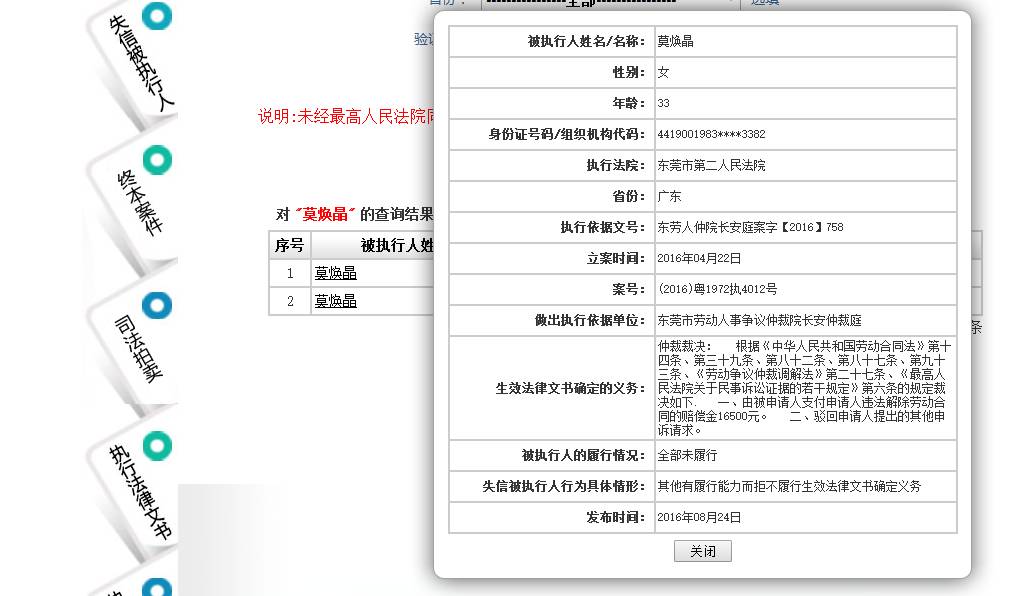 据中国执行信息公开网显示,2015年因他人无法清偿50000借款,莫焕晶作为连带担保人被起诉。2016年因违法解除劳动合同被判支付赔偿金16500元,因以上两笔资金全部未履行被列入失信被执行人。