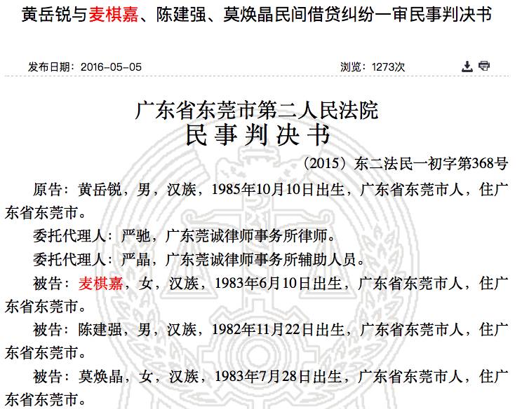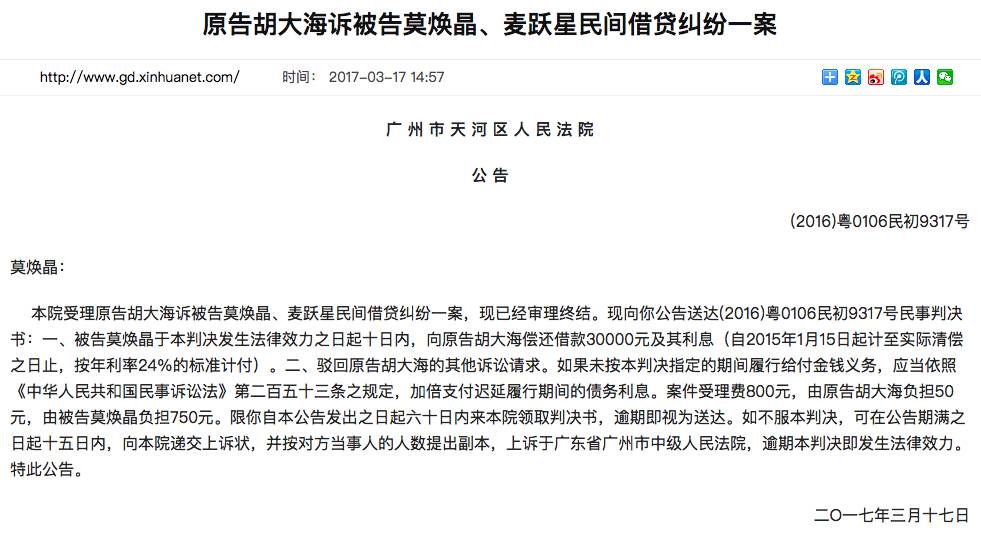 此外,侦探君(微信公号:jrjzt999)还发现,2017年3月17日,莫焕晶被广州市天河区法院判决,需偿还胡大海3万元借款及利息。