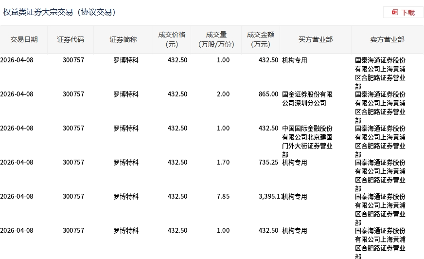 4月8日,罗博特科大宗交易成交14.55万股,成交额6292.88万元,占当日总成交额的1.37%,成交价432.5元,较市场收盘价475.28元折价9%。