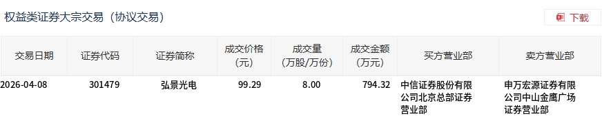 弘景光电今日大宗交易折价成交8万股,成交额794.32万元