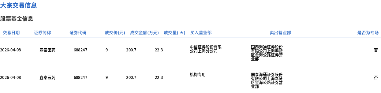 4月8日,宣泰医药大宗交易成交44.6万股,成交额401.4万元,占当日总成交额的9.57%,成交价9元,较市场收盘价9.76元折价7.79%。