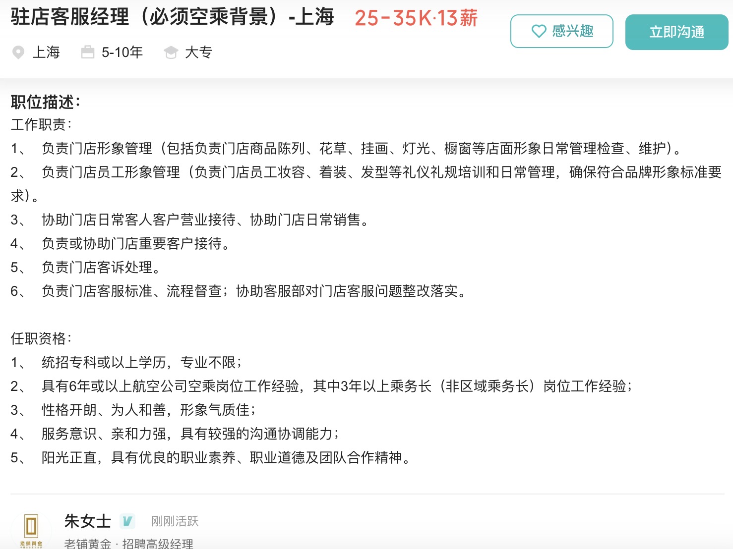 界面新闻记者查询发现,老铺黄金此前在其他招聘网站招聘西安等地驻店客服经理时,也曾提出过类似要求:形象气质端庄、为人和善,具有5年以上航空公司空乘岗位工作经验,具有乘务长工作经验,具体岗位职责也类似此次招聘内容。