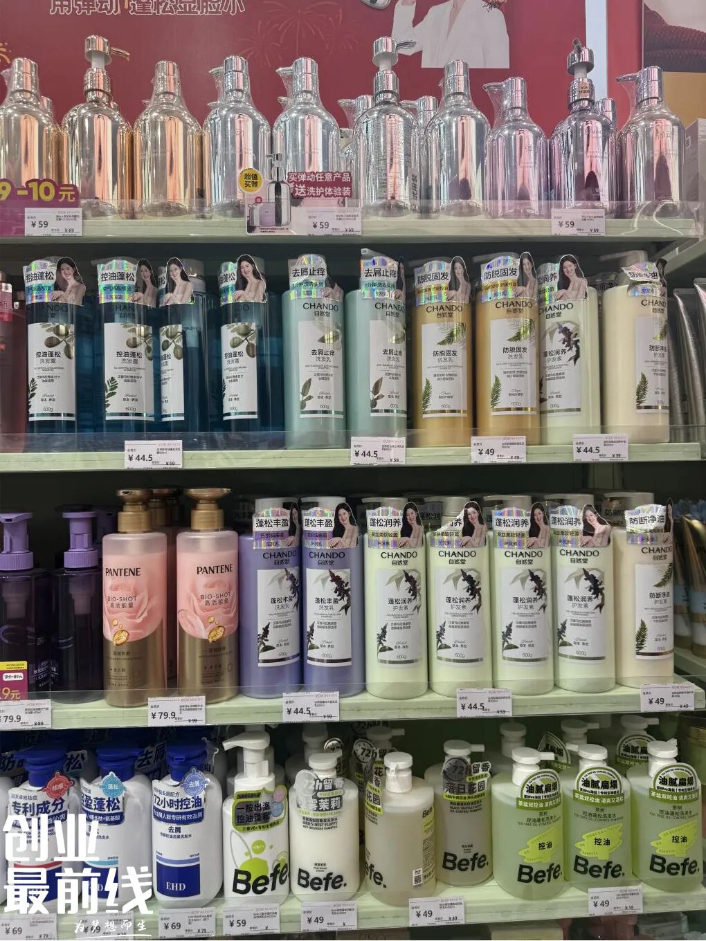 紧邻的自然堂控油蓬松洗发水定价59元(会员价44.5元)。店员表示,目前洗后蓬松是消费者的核心诉求,前来咨询这一类型产品的消费者比较多,所以不同品牌都主推蓬松功效产品。
