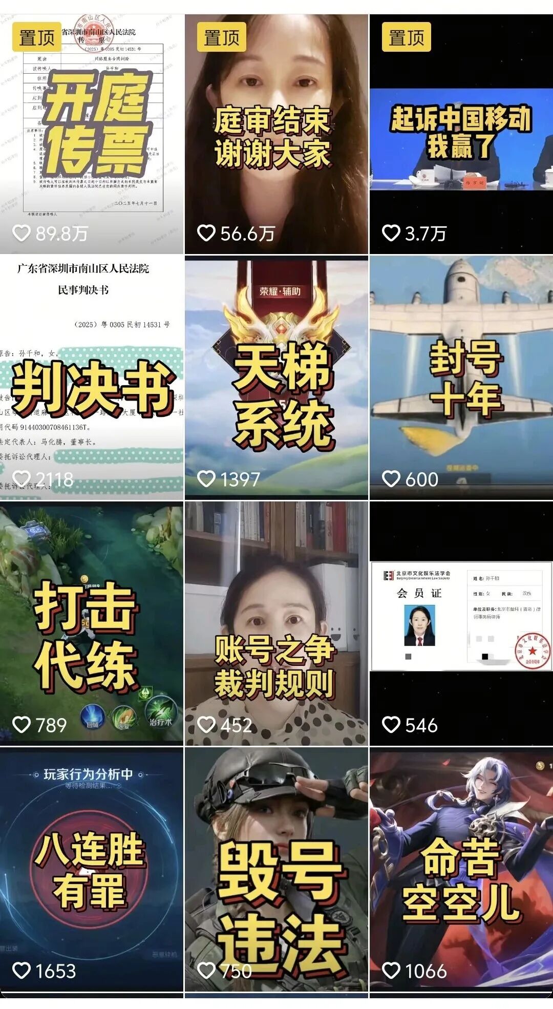 如今,她将类似策略复制到游戏领域。从她在社交平台的内容轨迹可以清晰地看到,此前她在抖音只发布了两条不温不火的视频,但自去年6月发布“王者荣耀法院见”视频后,其账号重心几乎全部转向与此案相关的内容。泼天流量,也推动其粉丝数暴涨至超过20万。