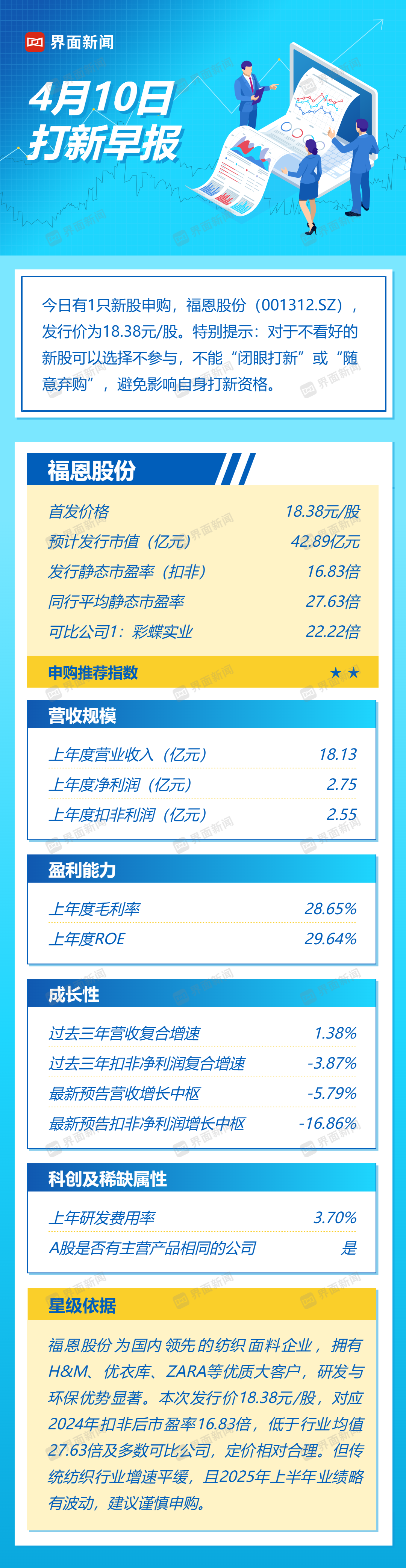 今日有1只新股申购,福恩股份(001312.SZ),发行价为18.38元/股。