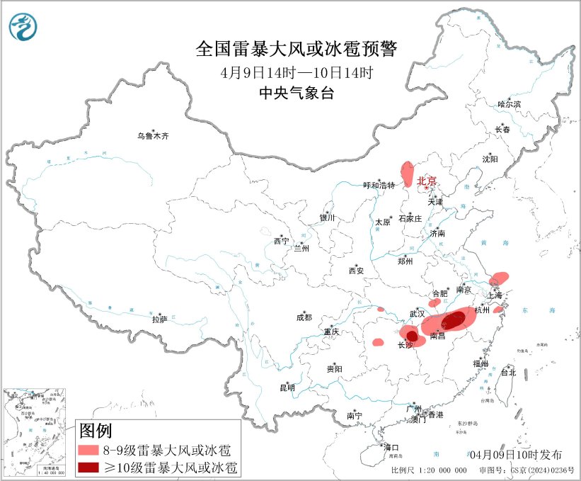 预计4月9日14时至10日14时,江南北部、河北西北部等地的部分地区将有8级以上雷暴大风或冰雹天气,其中,安徽南部、湖南东北部、江西北部等地的部分地区将有10级以上雷暴大风,最大风力可达11级以上,局地不排除出现龙卷的可能性;江南北部等地的部分地区将有小时雨量大于20毫米的短时强降水天气,其中,安徽南部、江西北部等地的部分地区小时雨量大于50毫米。