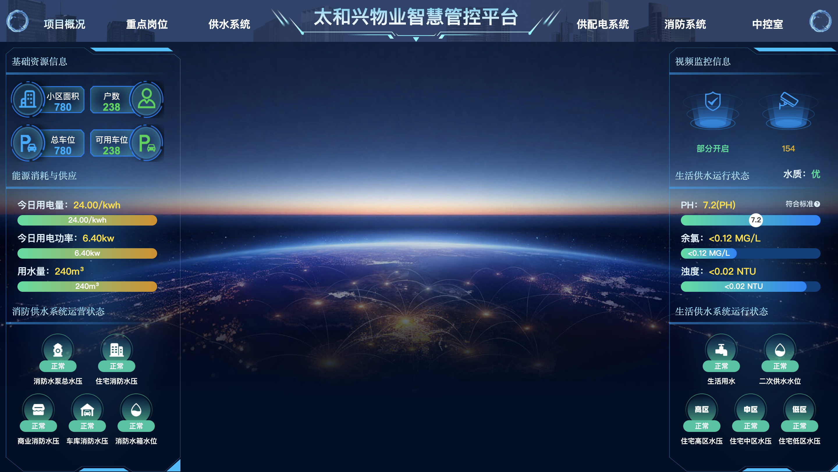 这也是太和兴的差异化发展方向,目前我们正稳步推进。今年我们刚完成一个老旧项目改造,为各类设备设施安装了智能传感系统,重点岗位、供水系统、供配电系统、消防系统、中控室等运行情况都可在智慧大屏可视化呈现,细化到每日实时用电量、用电功率、用水量、水质,以及机房发电机柴油液位,重点楼层、楼顶、车库、商业水压等数据,都可通过智慧管控平台收集、分析并辅助决策。