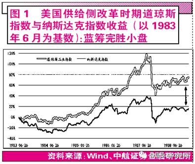 回顾美国供给侧改革,伴随着并购限制被解除,以实力强劲的大型公司为首的全行业掀起了一股并购潮,在这样的并购潮当中大盘蓝筹股受益明显,业绩得到改善,股价表现也更加优异。美国供给侧改革大致与里根总统的任期(1981-1989)重合,但考虑到里根总统上任后大规模收紧货币政策以对抗通胀,与我国目前稳健中性的货币政策不具有可比性。为剔除极端货币政策对股票市场的影响,我们只统计1983年货币正常化之后美国供给侧改革时期各指数的累计收益:代表大盘蓝筹股的道琼斯工业指数表现显著优于成长小盘股权重更大的纳斯达克指数。