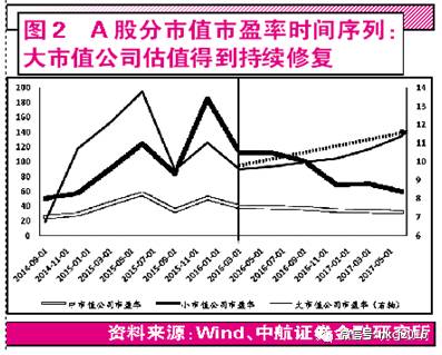 我们以美国金融业划分标准将A股所有股票划分为100亿美元以上、20亿至100亿美元以及20亿美元以下的大、中、小三个市值区间,以每一季度末作为市值统计结点,使用整体法TTM计算市盈率时间序列。可以看到自2016年2月的2638低点以来大市值股票的整体市盈率在稳步修复。这一趋势的开始与新的监管层上任时点相吻合,说明监管层引导市场回归价值、蓝筹投资的政策卓有成效。