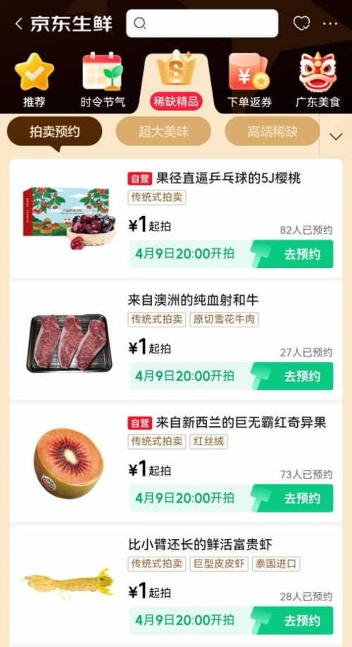 不仅是高端和牛,自2025年起,京东生鲜持续推出“超大生鲜”拍卖活动,迄今已汇聚超500款新奇特生鲜好物,每周四晚8点1元起拍,为消费者带来“捡漏”狂欢。本周,京觅大连美早樱桃、榴小七猫山王榴莲、佳沛巨无霸红奇异果、京鲜生新西兰进口红宝石梨、海蕴极鲜巨型富贵虾、鲜活南非鲍鱼等新奇特生鲜悉数亮相,以餐桌硬通货满足个性化饮食需求。