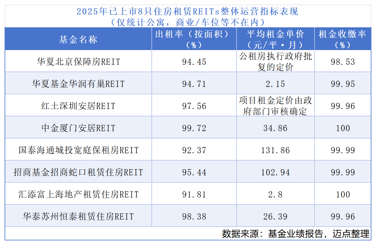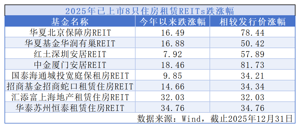 截至2025年末,已上市8只保租房REITs表现突出,较发行价整体平均涨幅近54%,最高涨幅约82%,涨幅表现领先其他公募REITs品类。