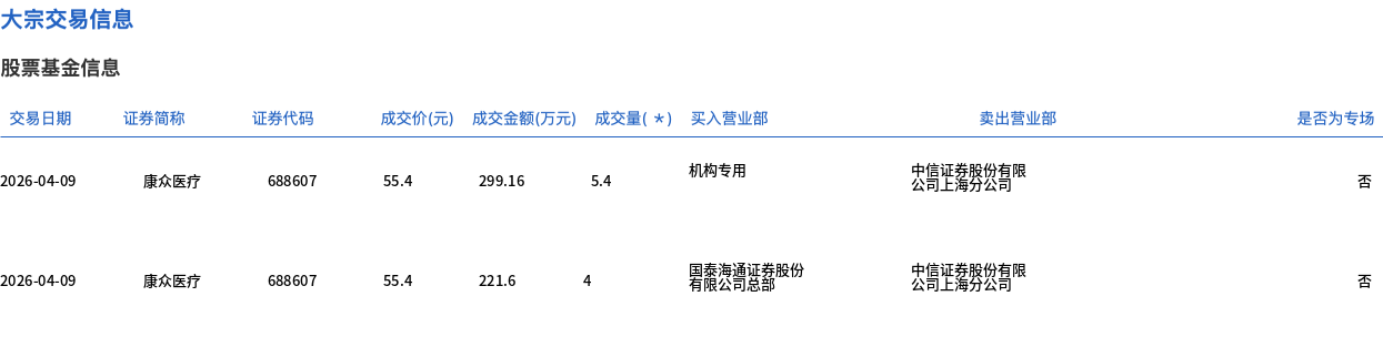 4月9日,康众医疗大宗交易成交9.4万股,成交额520.76万元,占当日总成交额的2.83%,成交价55.4元,较市场收盘价64.42元折价14%。