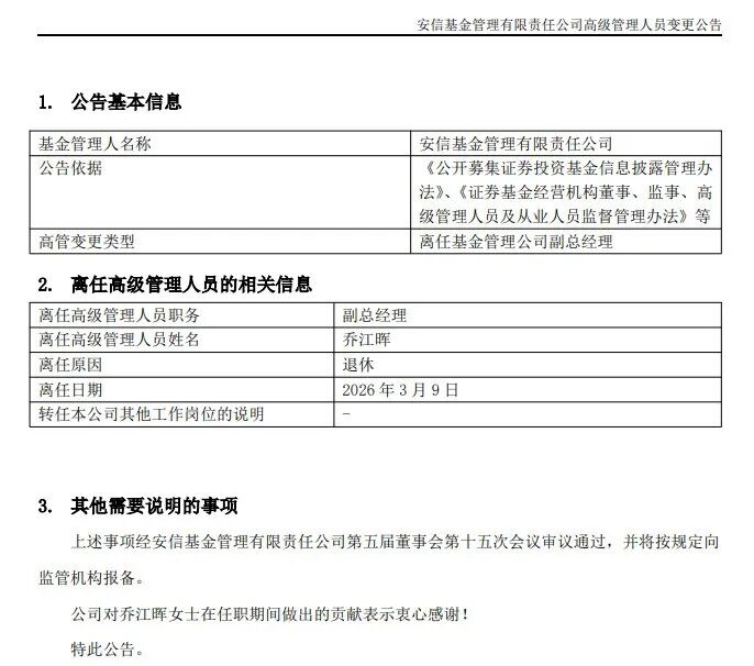 3月10日,安信基金发布高级管理人员变更公告,乔江晖退休离任公司副总经理。乔江晖是安信基金创始成员,在安信体系任职14年,全程参与公司筹建与发展。