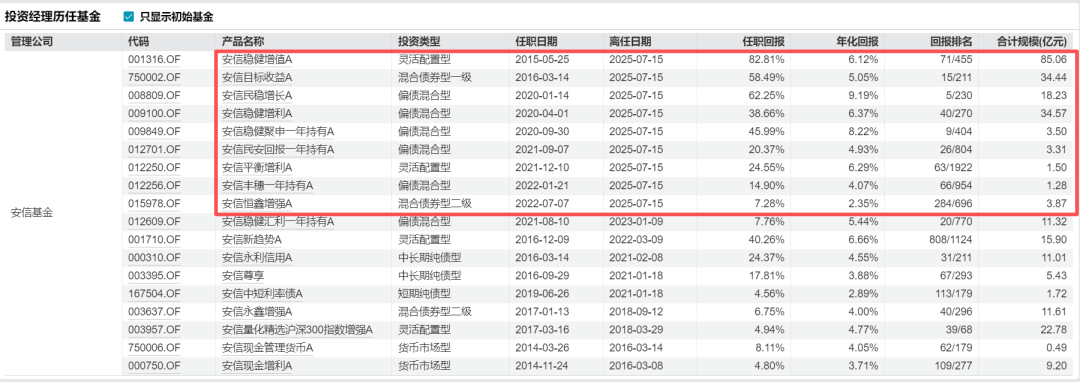 Wind数据显示,截至其离任张翼飞管理的9只基金任职回报均为正,其中任职回报超过50%的基金有3只,表现最为突出的“安信稳健增值A”,任职回报高达82.81%,管理时间长达10年,离任时该基金合计规模达85.02亿元,是安信基金的标杆产品。