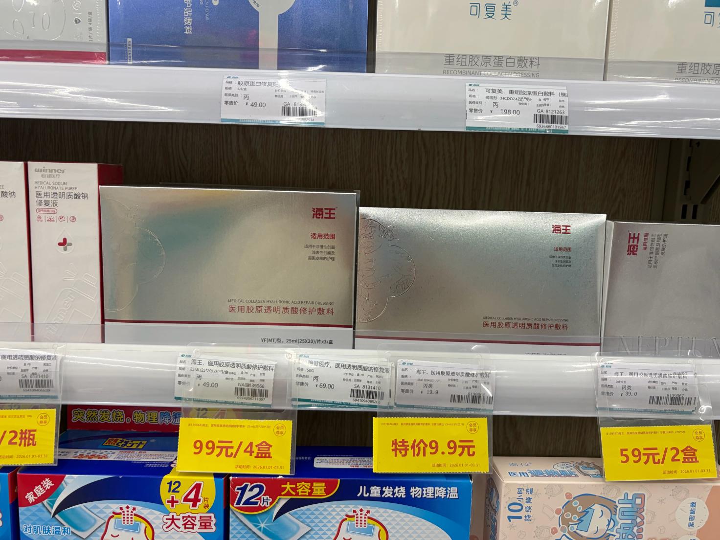 近日,《FBeauty未来迹》记者走访武汉多家连锁药店,捕捉到了一个耐人寻味的新动向:医用敷料正以接近快消品的方式,被摆放在药店更靠前的位置,与感冒灵、维生素等高频消费品相邻而陈,且一反曾经的定位高端打起了“骨折价”。
