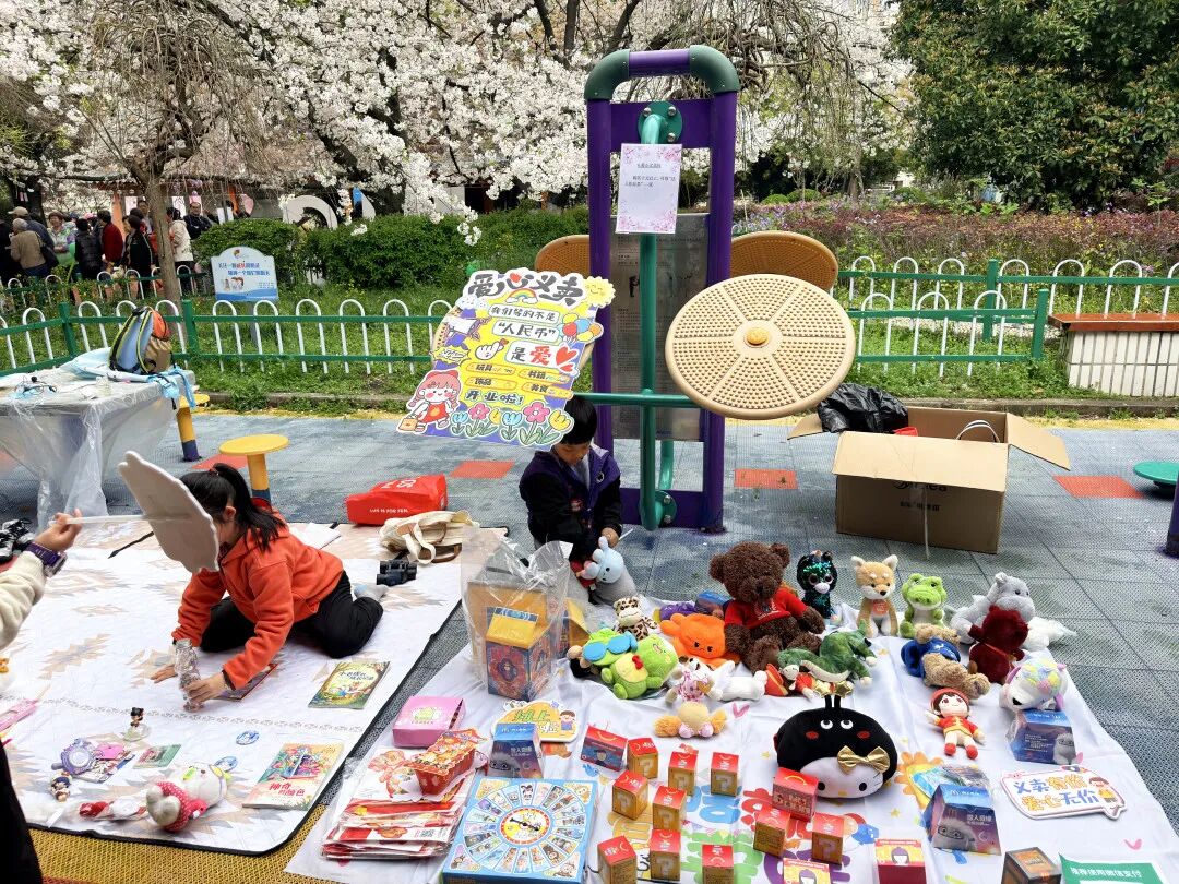 公益暖心,始终是共康七村樱花季不变的内核。10组亲子家庭化身“小掌柜”,在樱花树下摆开热闹的市集。闲置图书、玩具、手工艺品整齐陈列,樱花主题摊位、创意樱花盲盒吸睛无数。孩子们认真吆喝、热情推荐,在实践中学会分享与奉献。