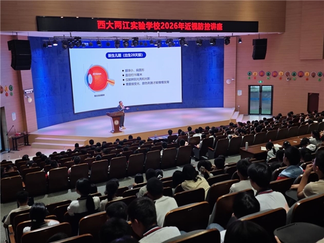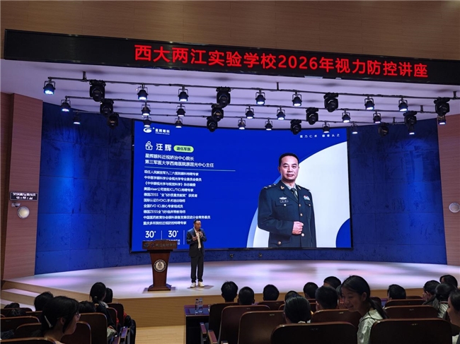 2026年4月9日,全国知名眼科专家、星辉眼科院长汪辉教授受邀走进西大两江实验学校,以“打赢视力保卫战 筑牢光明防火墙”为主题,为全校师生带来公益眼健康科普讲座,现场座无虚席,互动频频,有效将科学护眼理念送达校园一线。