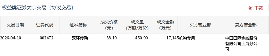 4月10日,双环传动大宗交易成交450万股,成交额1.71亿元,占当日总成交额的23.61%,成交价38.1元,较市场收盘价38.14元折价0.1%。