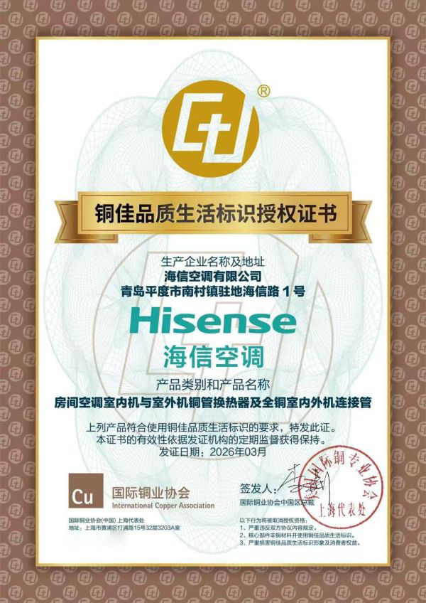 近日,海信空调正式获得国际铜业协会“铜佳品质生活标识”授权证书,并通过TUV南德第三方检测机构的材质评价认证,“海信空调 真铜实料”的品质承诺获得国际权威背书,也为广大消费者选购高品质空调提供了专业、可靠的参考依据。