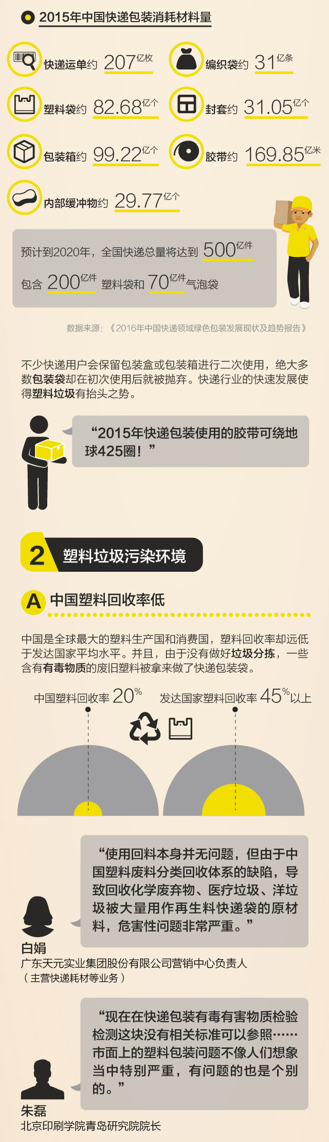 根据国家邮政局发布的《2016年中国快递领域绿色包装发展现状及趋势报告》,中国快递包装已经消耗了大量纸制品和塑料制品(大多数不可降解)。