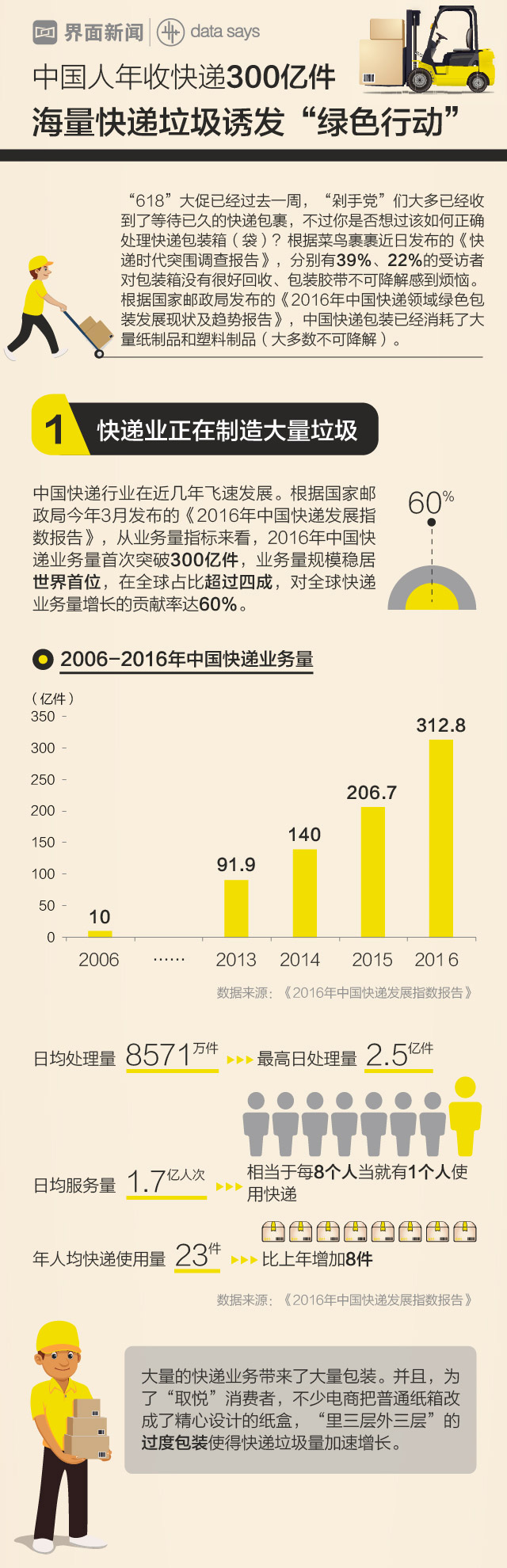 【图解】中国人年收快递300亿件 海量快递垃圾诱发“绿色行动”