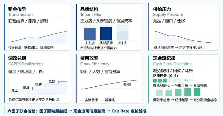 基于对资产运营与投资市场长期观察,我们将商业REITs的可信度拆解为一张六因子看板:每个因子对应一类运营机制,也对应一类风险折扣。因子越清晰、越稳定、越可验证,资产的可信度越强,市场就越愿意降低风险溢价。