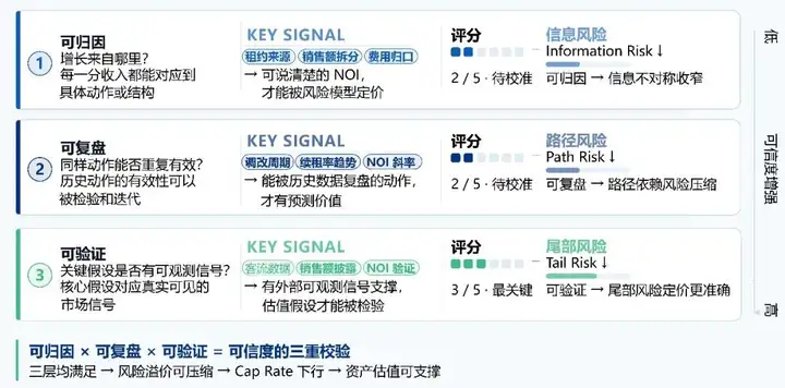 第一层是可归因。增长来自哪里,是租金传导效率提高,还是品牌结构升级带来议价能力,还是供给压力缓解带来恢复性反弹?如果增长无法归因,它就很难进入定价模型,因为你无法判断它是机制性改善还是偶然性波动。