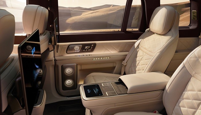 座舱部分,ES9配备15.6英寸AMOLED中控屏、48英寸天际屏以及NOMI Mate 3.0,整体仍是蔚来熟悉的智能座舱路线。不同于一般三排SUV更偏家用的处理方式,ES9在第二排加入了更明显的行政化表达,包括左右独立分区、中岛控制、后排桌板/控制屏、无线充电和多种外接电源接口等,并提供6座中岛版和6座通道版两种布局。双侧独立天幕与电动遮阳帘及部分车型配有的刺绣,也在继续强化体验。