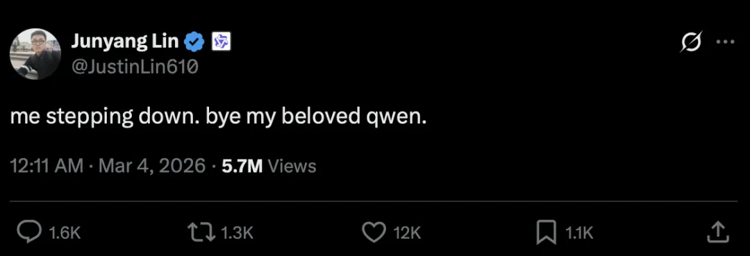 2026年3月4日凌晨,当时的通义千问技术负责人林俊旸在社交平台X(原Twitter)上发布了一条简短的推文:“me stepping down. bye my beloved qwen.”(我卸任了。再见了,我深爱的千问。)