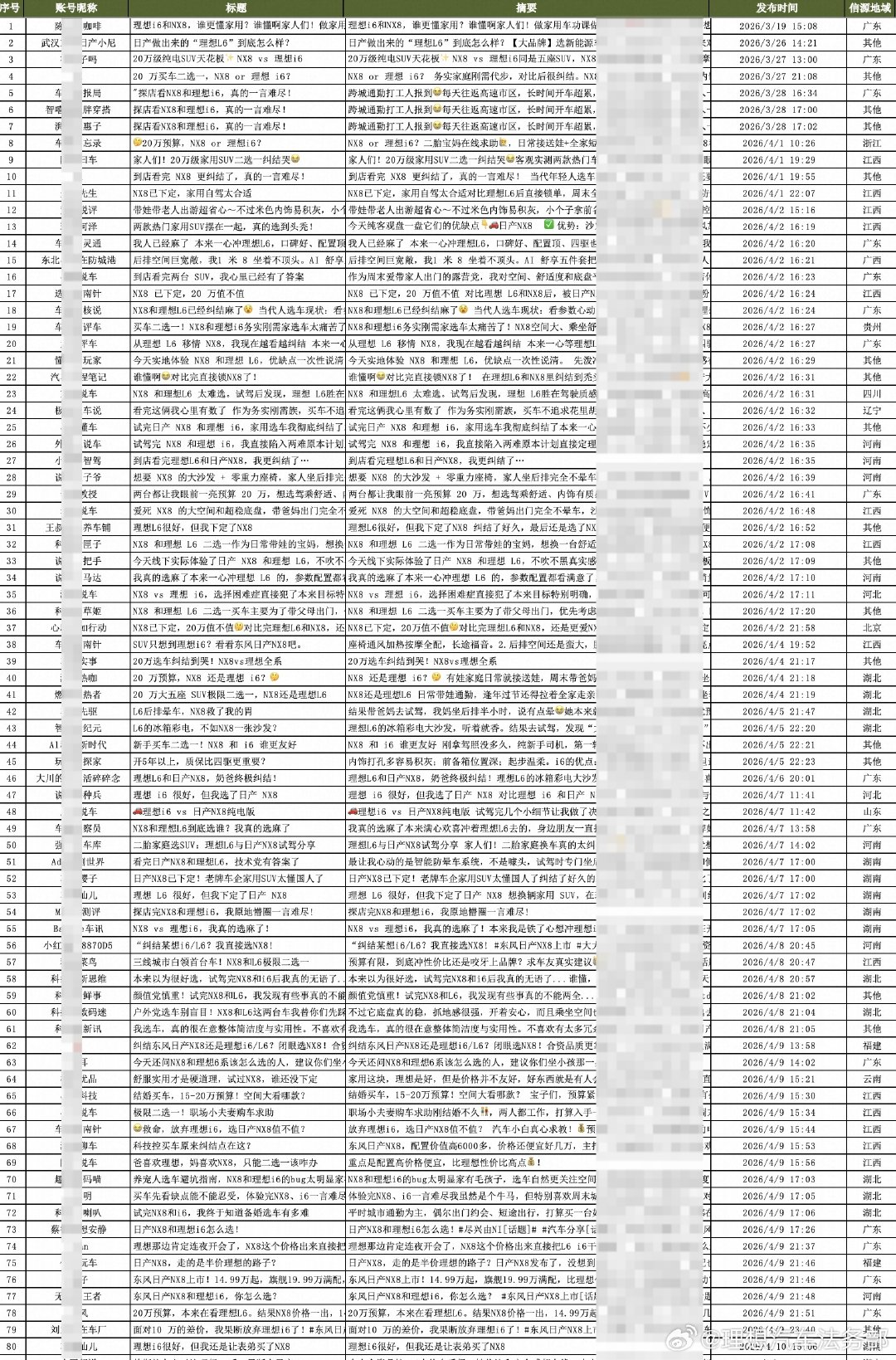 界面新闻记者在社交平台检索发现,关于东风日产NX8与理想i6、L6的对比帖数量不少。相关内容多以对比为名,引导用户转向购买NX8,评论区内也出现“最后还是选择NX8”等相似回复。在李想公开发声后,部分帖子已删除,或对涉及理想i6、L6的内容进行了修改。