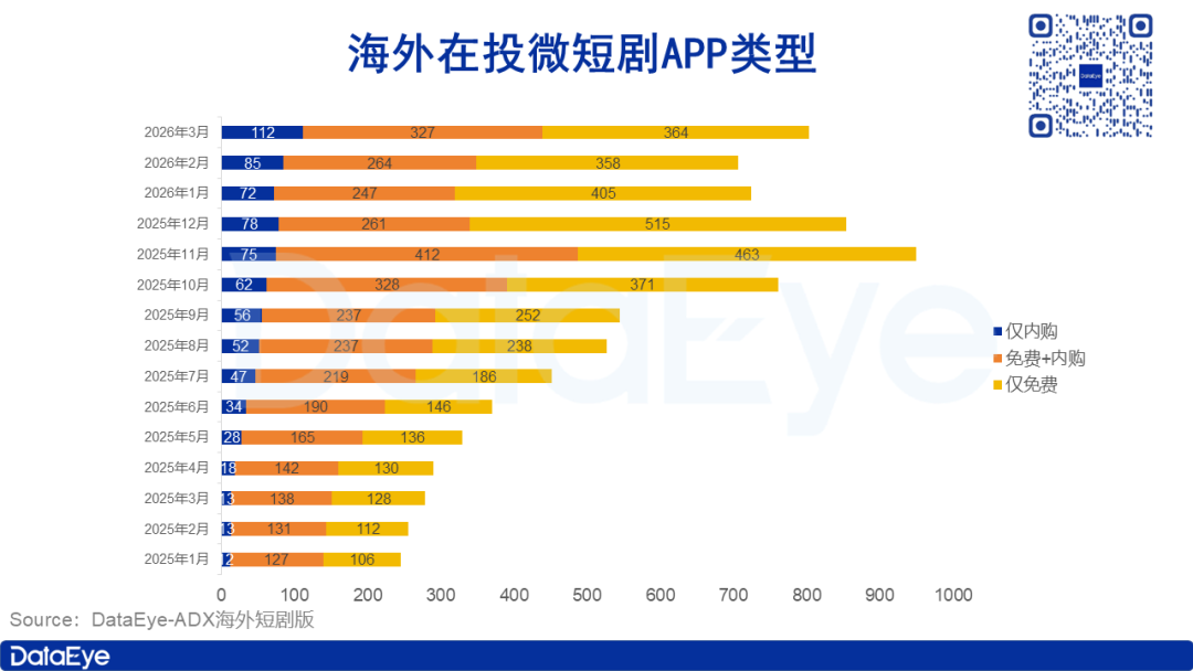 根据DataEye-ADX海外短剧版数据统计,2026年3月,海外在投微短剧APP共计800款,环比下滑7%,当月新增APP数量为83款;海外在投微短剧APP数量已连续三个月出现下滑,但新增APP数量出现回升。