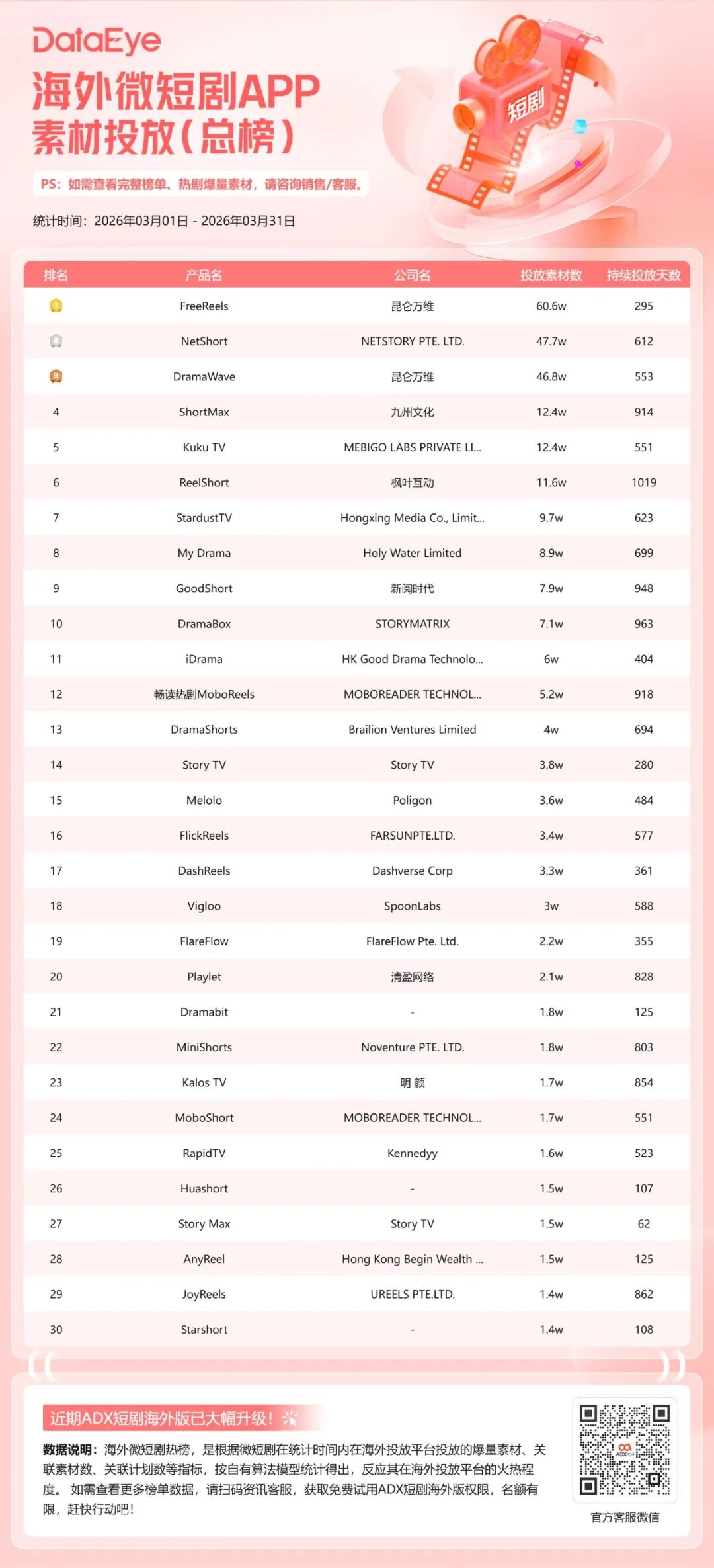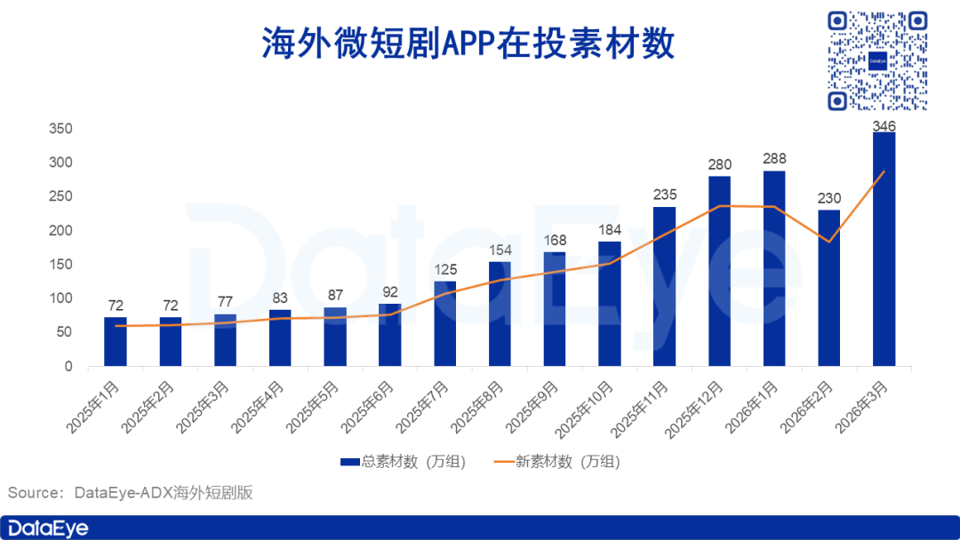 根据DataEye-ADX海外短剧版数据,2026年3月海外微短剧市场广告素材投放量达346万组,环比2月大幅增长50%。