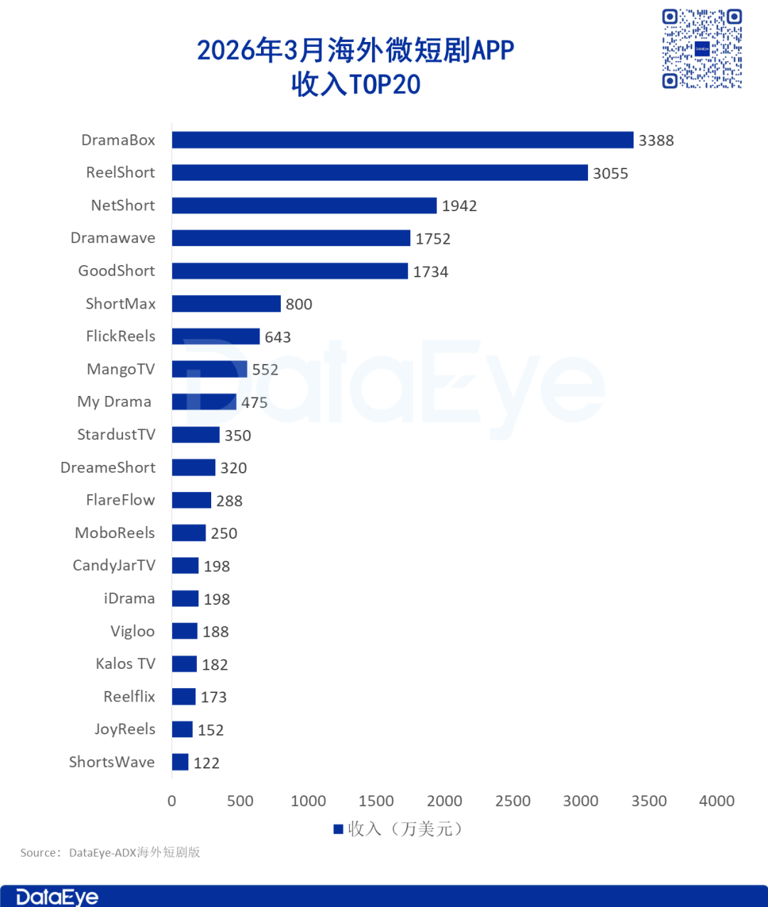 2026年3月海外微短剧APP收入TOP20排行榜中,头部前五格局稳定、座次略有调整。DramaBox重回榜首,ReelShort紧随其后,两者合计收入占TOP20总收入的38%,形成绝对的双寡头格局。NetShort(1942万美元)、Dramawave(1752万美元)、GoodShort(1734万美元)稳居第二梯队,收入均在1700万-2000万美元区间。