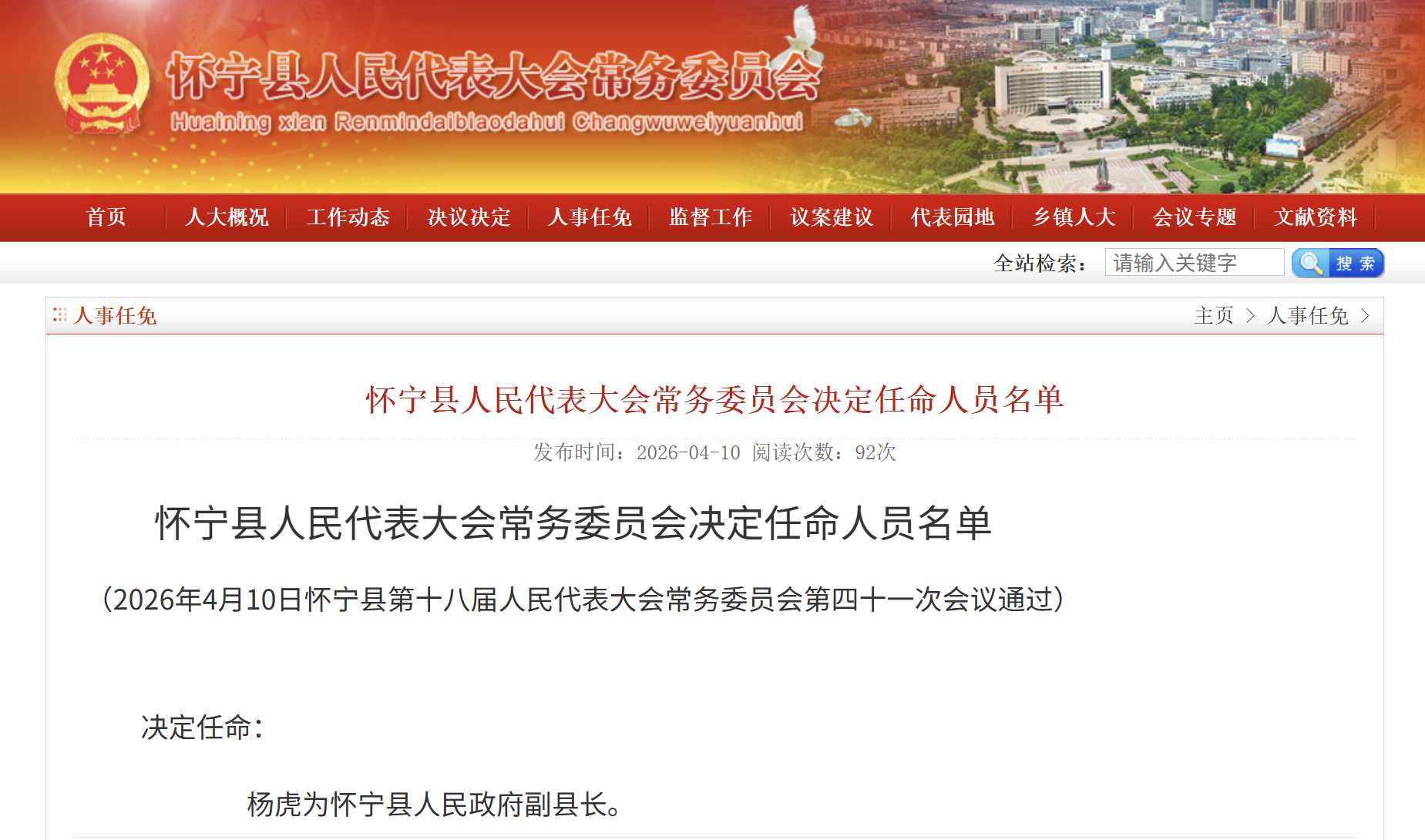 2026年4月10日,怀宁县第十八届人民代表大会常务委员会第四十一次会议通过人事事项,决定任命:杨虎为怀宁县人民政府副县长。