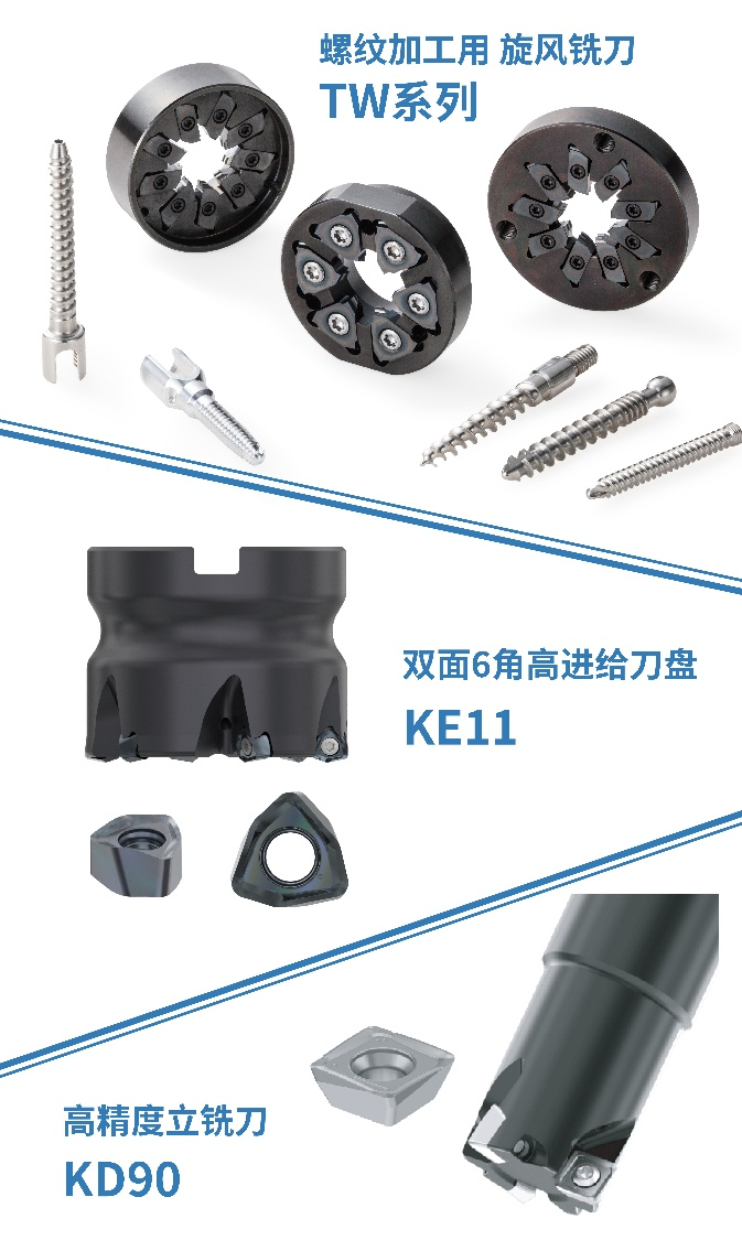 本次京瓷展台,将展出各类车削、铣削产品。尤其值得一提的是,京瓷将带来汽车、摩托车、航空、医疗、半导体、AI服务器、人形机器人等多领域的成功案例,以及新产品螺纹加工用旋风铣刀TW系列;为适应中国国内加工需求所开发的产品、双面6刀尖高进给刀盘KE11;高精度立铣刀KD90等。