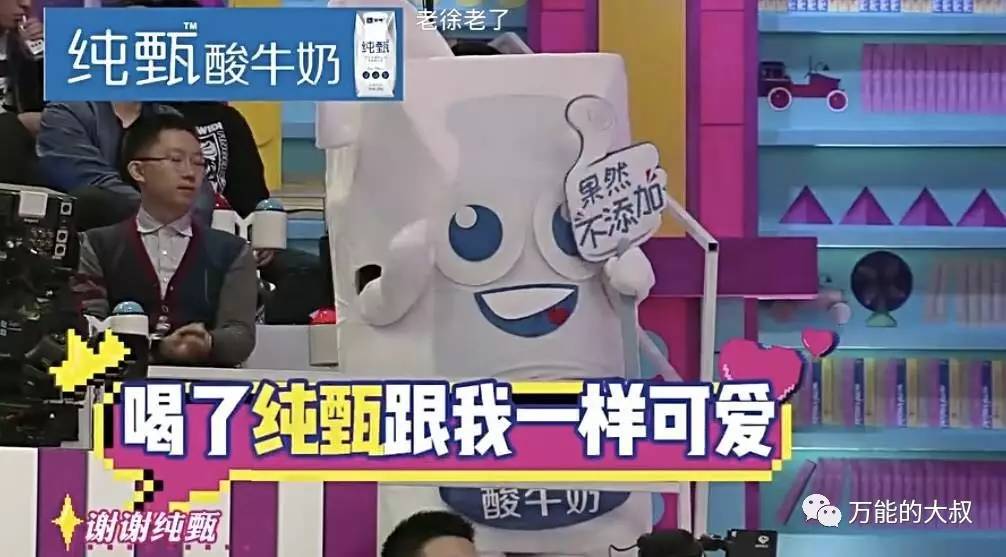 无论是明确说出品牌,还是在聊真话假话这个话题,大家都在潜移默化地传递“奶后吐真言”这个核心信息。再加上大家没事就拿个纯甄酸牛奶喝了起来,这样文案和画面的合二为一,起到了立体传播的作用。大叔觉得,“喝奶”这样的画面感也是食品品牌最具天然优势的一种植入方式,纯甄酸牛奶在“跑男”等综艺节目中都延续了这种风格。实际上,为了突出形象,蒙牛还不限于在节目中摆放产品,甚至还制作了一个大玩偶,给主持人增加了一个吐槽的对象。
