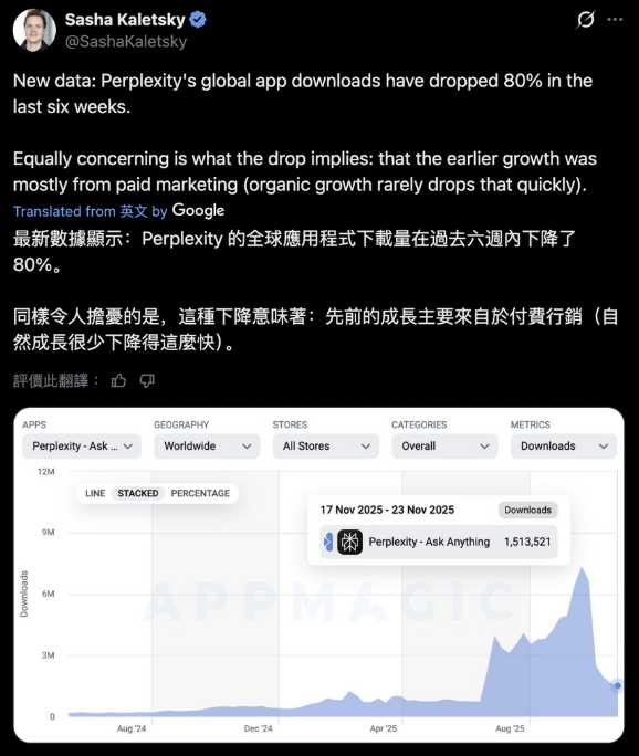 Perplexity在去年下半年出现了80%的下载量下滑。