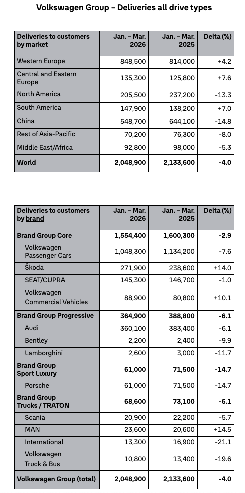 4月13日,大众汽车集团公布交付数据,2026年第一季度全球交付量达204.89万辆,同比减少4%,其中中国市场交付量为54.87万辆,同比减少14.8%。