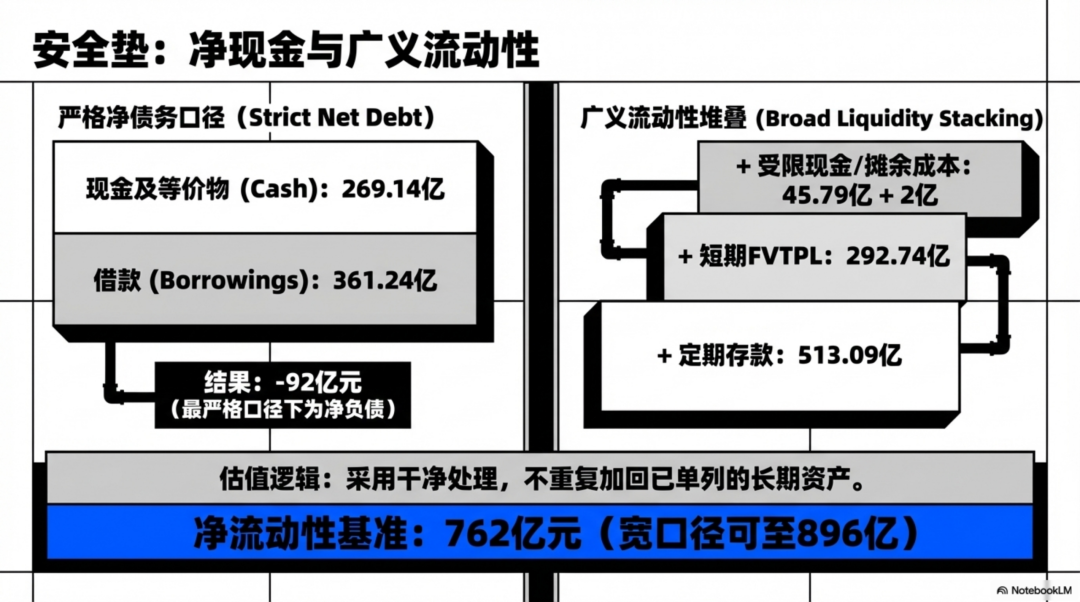 如果再把长期摊余成本投资 134.06 亿元也算进来,净广义流动性大约是 896 亿元。但这里有个原则:已经单列为长期股权投资或长期 FVTPL 投资的部分,不能再重复加回。