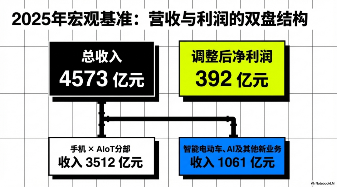 2025 年,小米总收入 4573 亿元,调整后净利润 392 亿元;其中 手机 × AIoT分部收入 3512 亿元,智能电动车、AI 及其他新业务收入 1061 亿元。