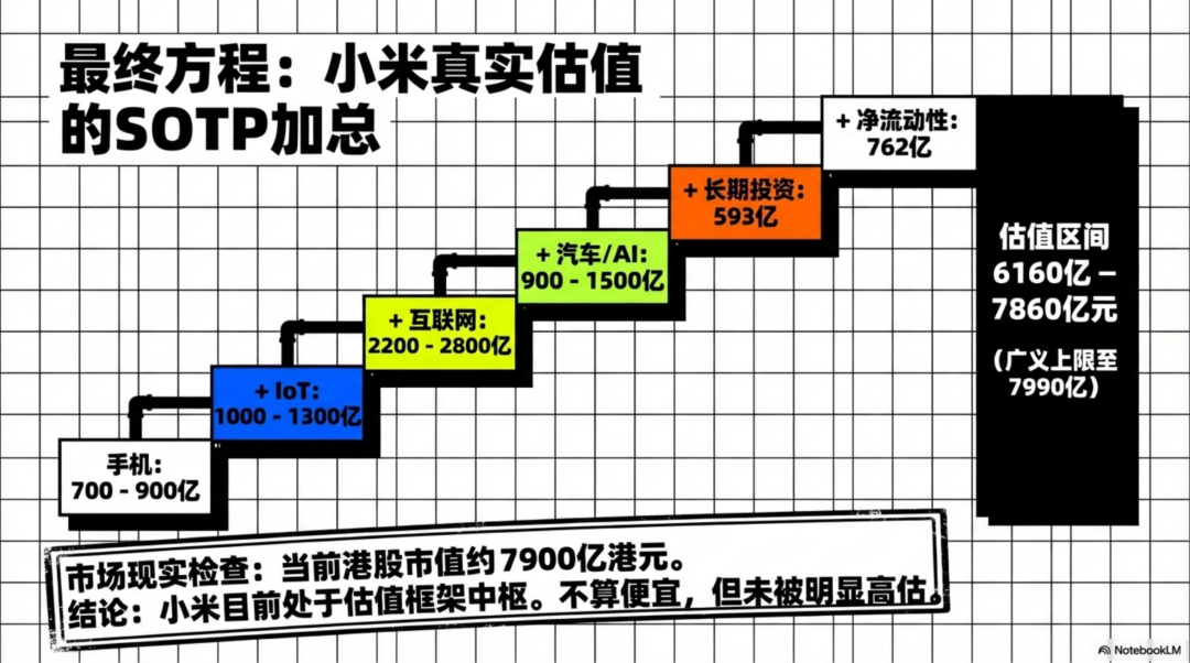 对照当前大约 7900 亿港元市值,小米现在更像是处在这套估值框架的中间。