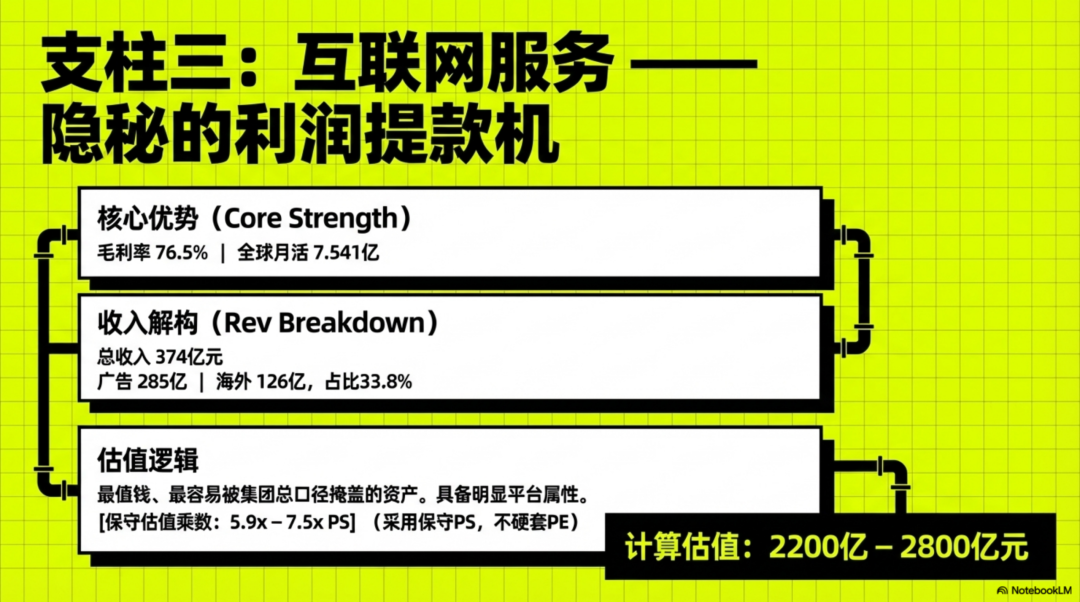 收入不算巨大,但利润极厚,而且边际扩张轻,已经有明显平台属性。由于公司没有单独披露互联网服务净利润,我还是用保守一点的 PS 去估,而不硬套 PE: