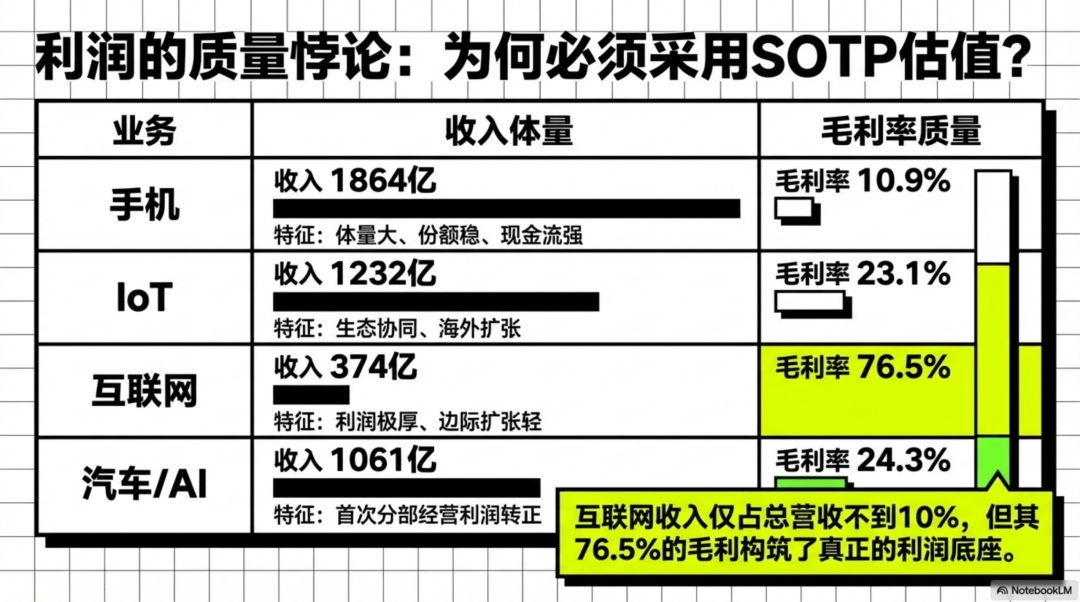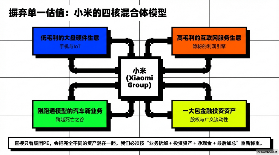 小米不是单纯的手机股,也不是纯互联网股。它更像“硬件现金牛 + 高利润互联网 + 已跑通的汽车新业务 + 一包金融投资资产”的混合体。