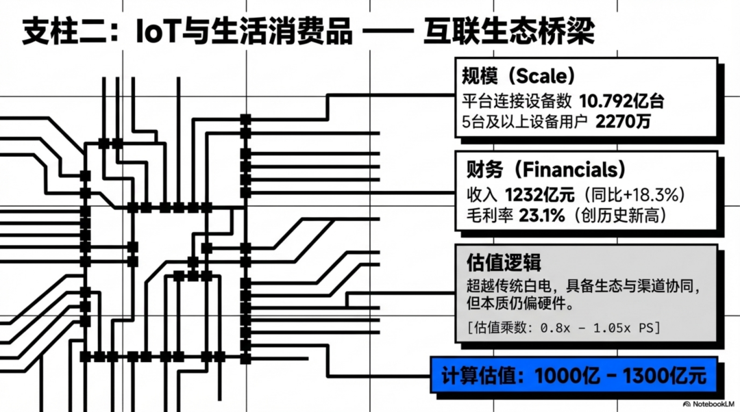 2025 年 IoT 与生活消费品收入 1232 亿元,同比增长 18.3%,毛利率升到 23.1%,创历史新高。到 2025 年底,小米 AIoT 平台连接设备数达到 10.792 亿,5 台及以上设备用户达到 2270 万。