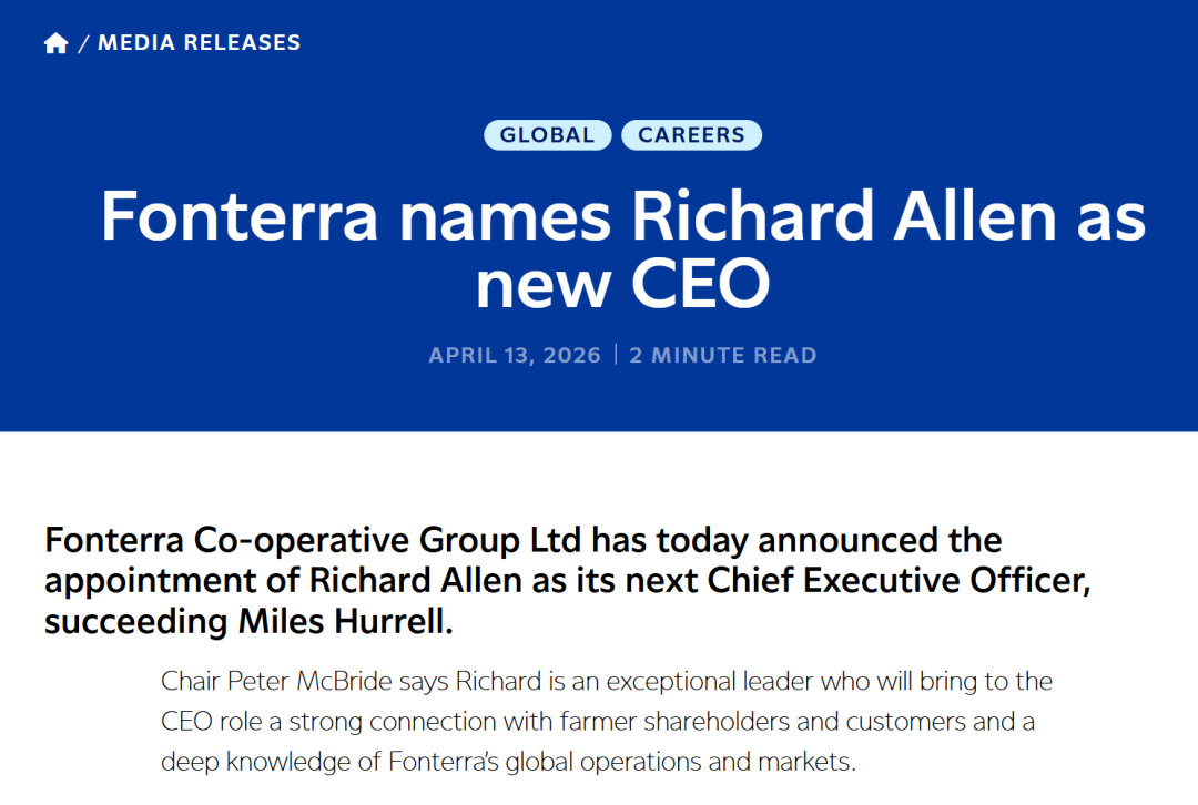 今天,这家新西兰乳业合作社宣布,任命Richard Allen为下一任首席执行官,接替在恒天然效力25年、掌舵八年的现任首席执行官郝万里(Miles Hurrell)。Richard Allen将于2026年5月1日正式履新。