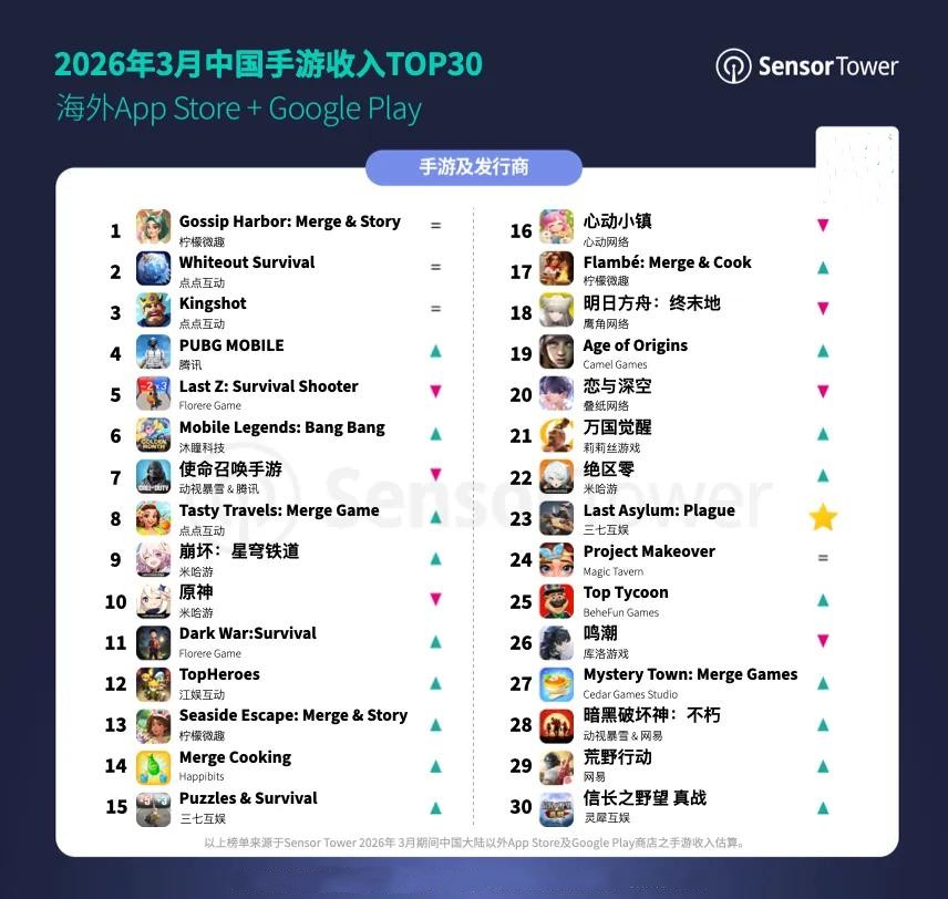 从榜单表现来看,多家头部厂商通过产品运营与内容更新实现收入增长。通过阶段性活动驱动用户参与与付费转化,《Gossip Harbor》凭借成熟变现与高效运营持续领跑。点点互动凭借《Whiteout Survival》等产品稳居全球第二,紧随其后的还有Kingshot、PUBG等榜单常客。