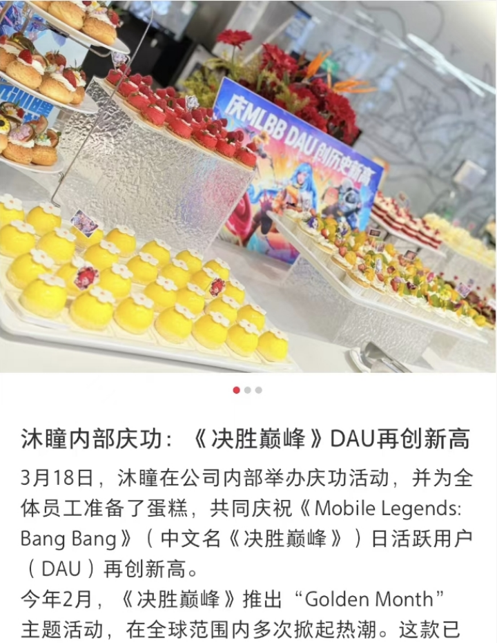 3月18日,沐瞳在公司内部举行了庆功活动,为全体员工准备蛋糕,庆祝《Mobile Legends: Bang Bang(中文名:决胜巅峰)》日活跃用户(DAU)再创新高。